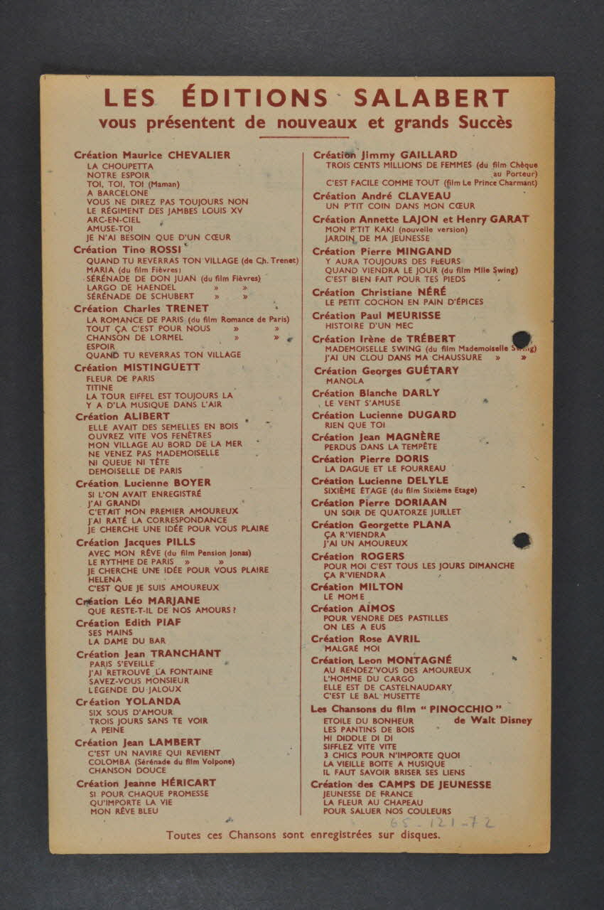 La première page présente la photographie de Jean Lambert. Les inscriptions précisent le titre de la chanson, l'auteur et l'éditeur. A l'intérieur se trouvent la partition et les paroles de la chanson. Au dos, une liste de morceaux disponibles chez le même éditeur.Matériaux et techniques