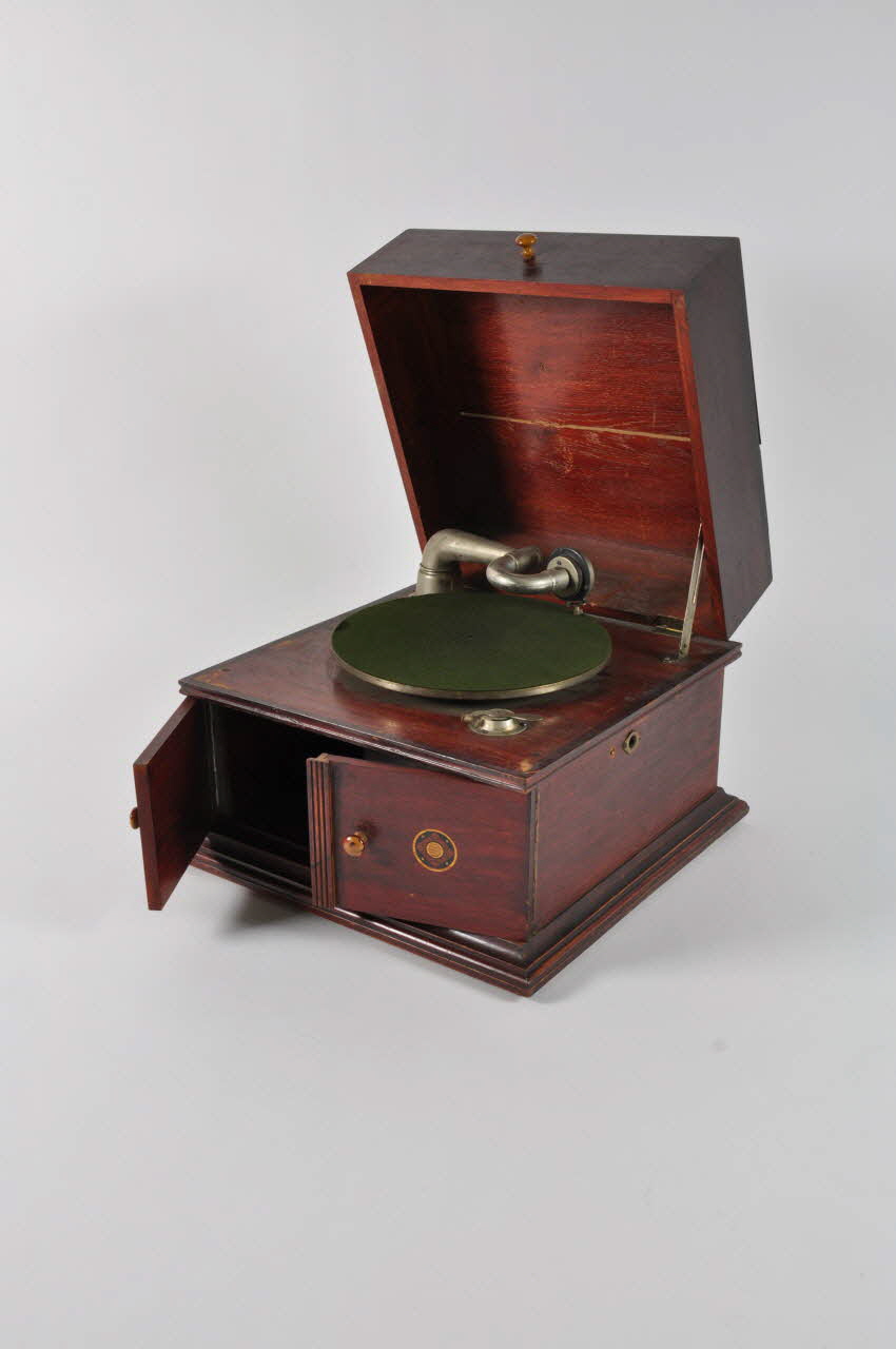 A l'intérieur, un plateau circulaire recouvert de drap de laine vert, avec un bras mobile chromé avec aiguille.