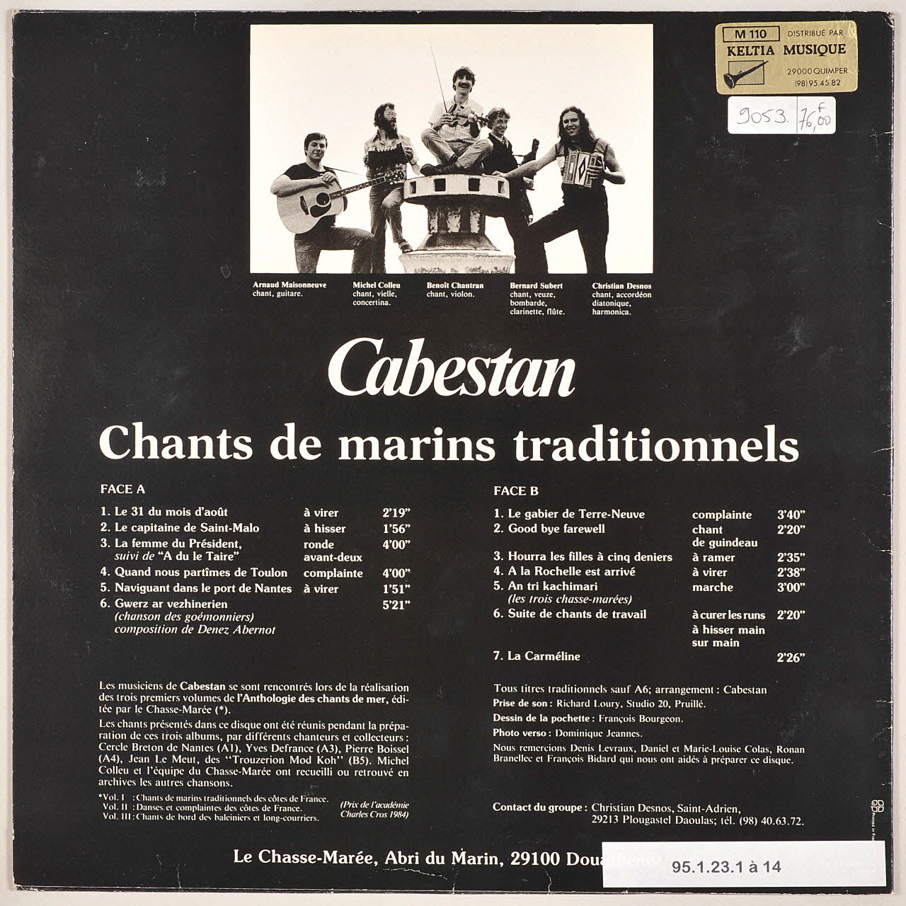 disque 33 tours, A du le taire, Good bye farewell, Le 31 du mois d'août, Quand nous partîmes de Toulon, Gwerz ar vezhinerien, Chants de marins traditionnels, Hourra les filles à cinq deniers, La Carméline, An tri kachimari, Naviguant dans le port de Nantes, Le capitaine de Saint-Malo, A la Rochelle est arrivé, Le gabier de Terre-Neuve, La femme du président