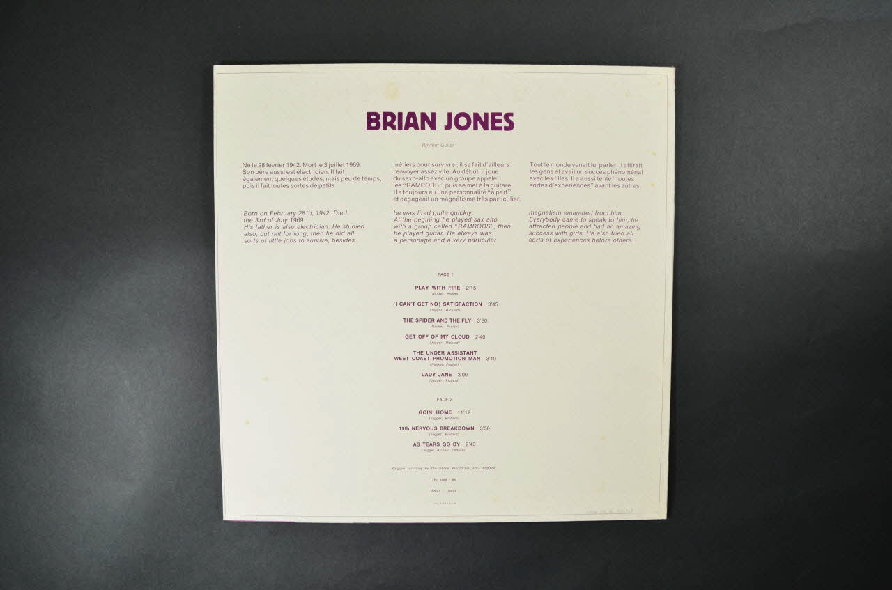 .2 : La pochette est de forme carrée, en carton, imprimée en couleur, pliée et collée. Les inscriptions sont en anglais et en français. L'ensemble est en blanc et violet. Le recto représente le portrait photographique, en violet et blanc, de Brian Jones. Au verso, figure une petit texte sur l'artiste, en anglais et en français. Puis, sont inscrits les titres de l'album.Inscriptions
