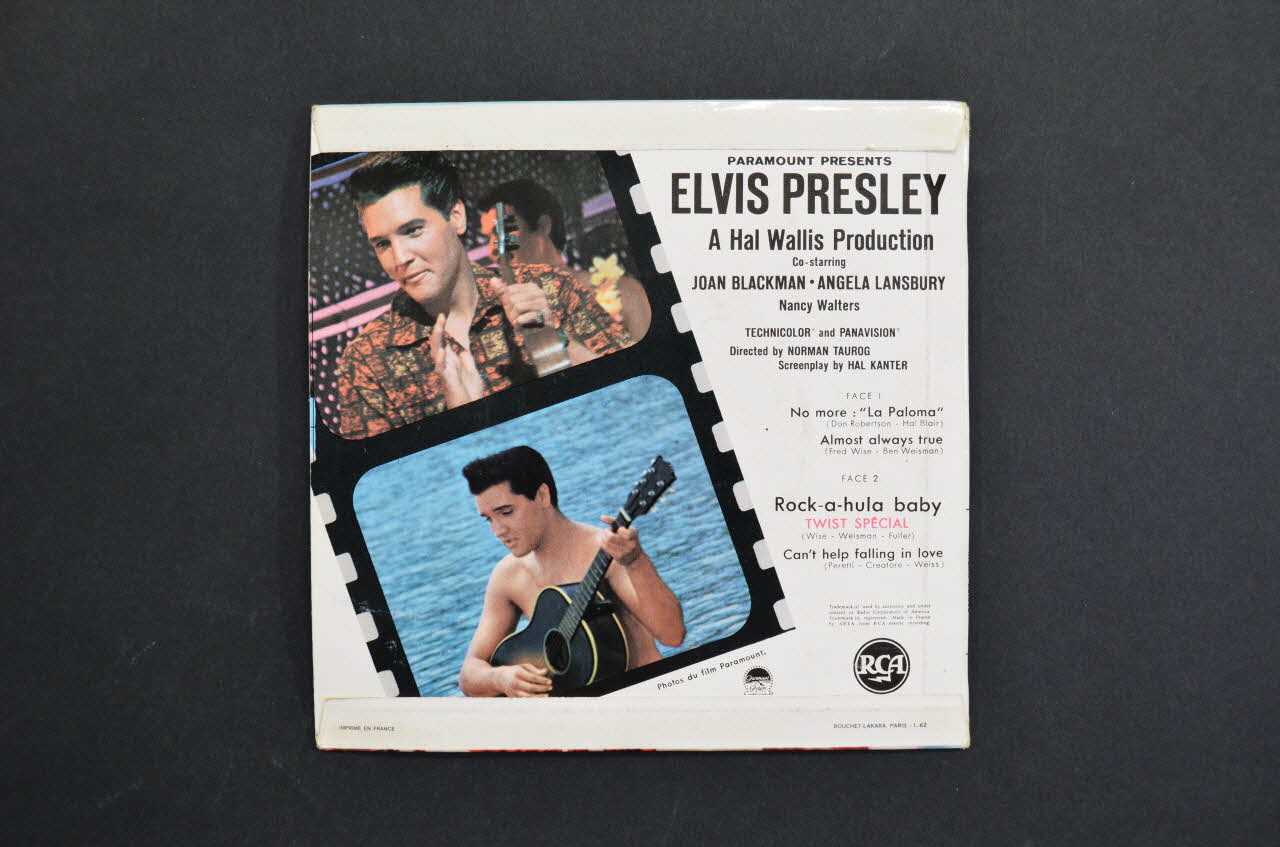 Le recto comporte un portrait couleurs du chanteur avec un collier et une chemise hawaïens. Le nom de l'artiste, le titre des chansons sont inscrits en jaune et bleu. Le logo de l'éditeur est dans l'angle supérieur droit. Le verso contient deux photographies couleurs du chanteur comme une pellicule de film, le nom de l'artiste, le titre des chansons et le logo de l'éditeur sur fond blanc. Le disque rond et noir comporte une perforation circulaire au centre. Une étiquette bleue contenant le nom du chanteur, le titre des chansons, le logo de l'éditeur ainsi que d'autres inscriptions en gris est collée au centre.Matériaux et techniques