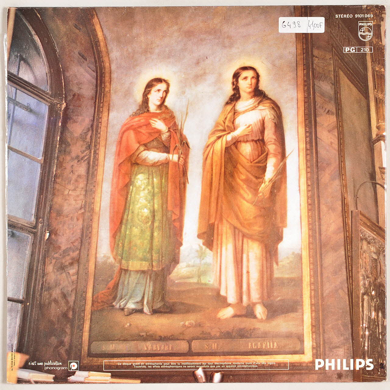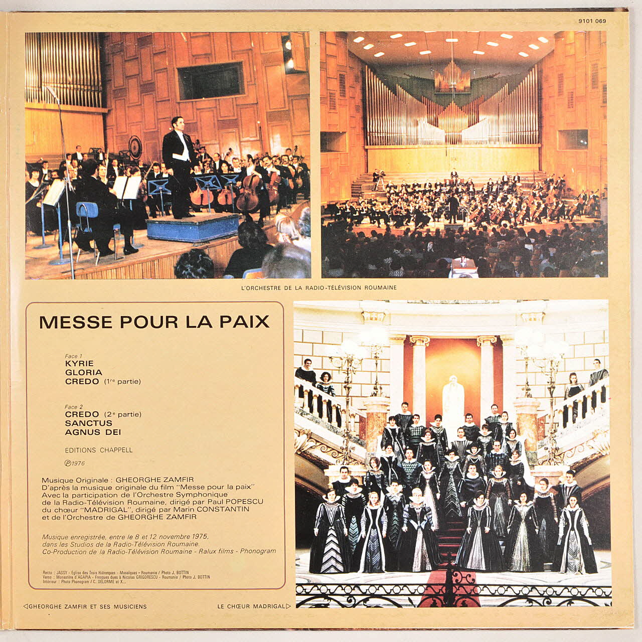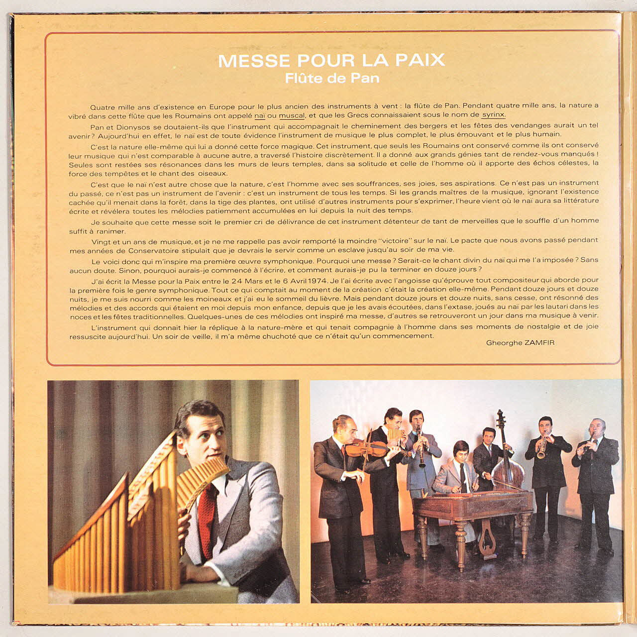 Le verso présente une photographie couleur d'une fresque d'église. Deux femmes, en pied, se tiennent debout dans un paysage. Elles portent toutes les deux une palme de martyr dans la main. La pochette s'ouvre. Le volet gauche comporte un texte de Zamfir au sujet de son oeuvre symphonique et de la flûte de Pan, et deux photographies couleur (Zamfir devant ses instruments et Zamfir avec ses musiciens). Le volet droit présente deux photographies couleurs de l'orchestre de la RTR dans une salle de concert et le choeur "Madrigal" en costume, dans un grand escalier, ainsi qu'un encart contenant les morceaux joués. L'étiquette du disque est noire.Inscriptions
