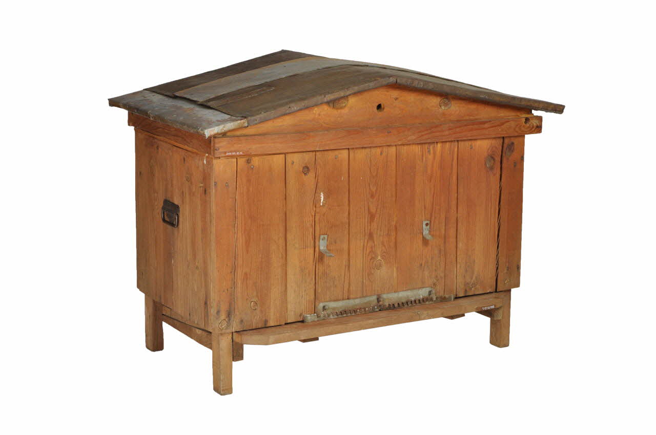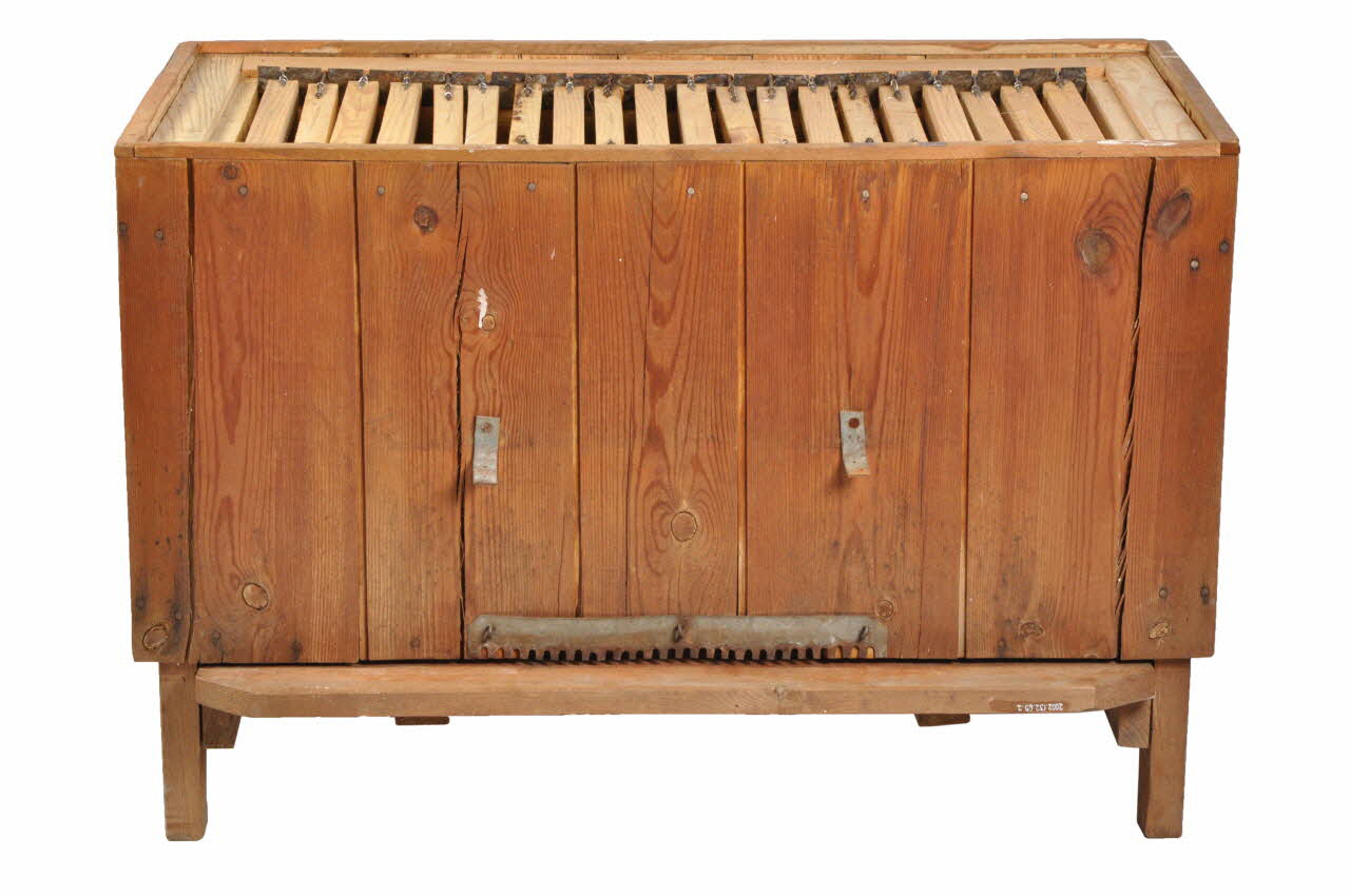 Ruche en bois constituée d'un corps principal couvert d'un toit à deux pans et d'une planche coulissante servant de fond. A l'intérieur, quinze planchettes couvrent vingt cadres mobiles.
