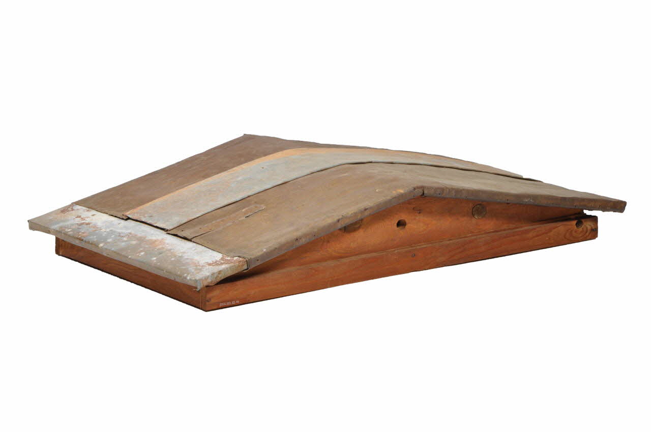 Le couvercle de l'ensemble, 2002.132.65.44, figure un toit à deux pans posé sur une structure de plan rectangulaire. Le toit est couvert de plusieurs plaques de tôle de fer clouées. Le bord inférieur des parois est caractérisé par quatre planches clouées en légère saillie. Sur les deux longues faces, une perforation circulaire au centre. Ces deux ouvertures sont grillagées en face intérieure.