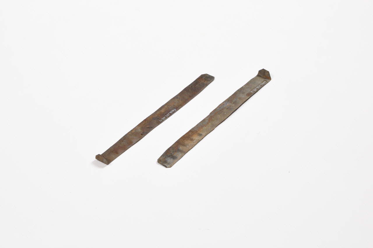 Certains clous du bord supérieur de certains cadres se détachent. Le clou antérieur du cadre 2002.132.65.24 est numéroté 2002.132.65.40 et le postérieur 2002.132.65.41. Le clou antérieur du cadre .31 et numéroté 2002.132.65.42 et celui du cadre .38 est numéroté 2002.132.65.43. / Ancienne description :
