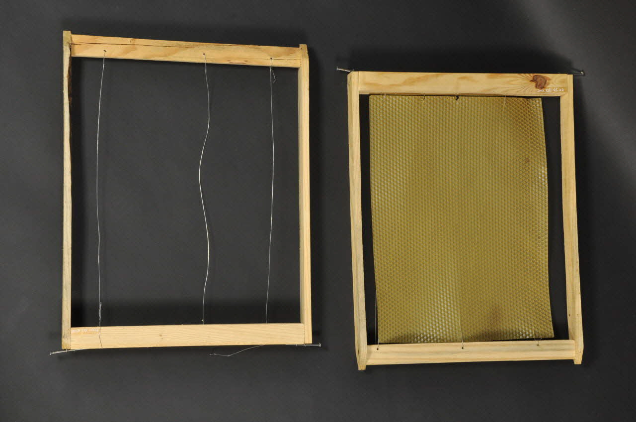 Sur le cadre 2002.132.65.20 est fixée une plaque rectangulaire de cire alvéolée. Elle tient par le biais du fil métallique, que la traverse à divers endroits.