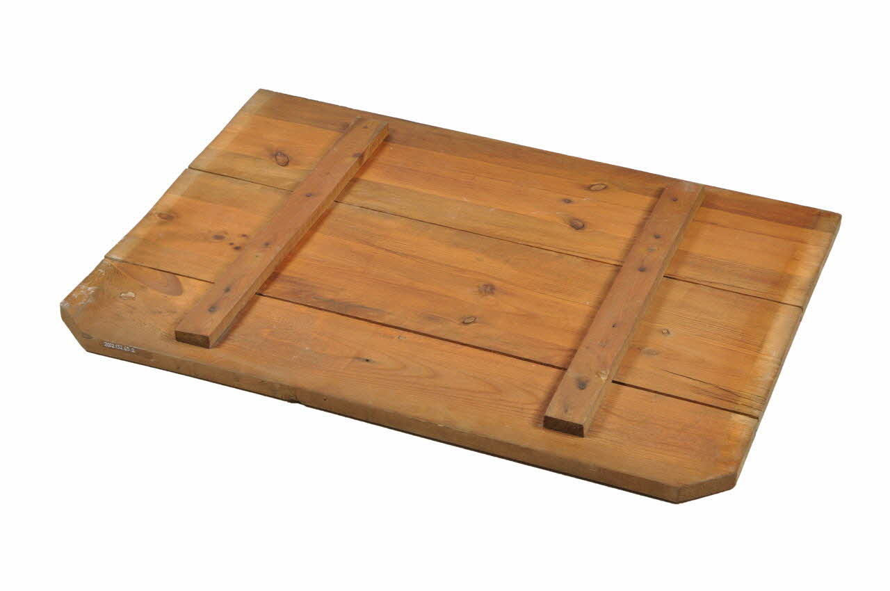 En partie inférieure, deux rails en bois permettent de faire coulisser la planche 2002.132.65.2, qui sert de fond. Elle est composée de trois planches assemblées par un système de rainures et languettes et renforcées par deux planches perpendiculaires vissées sur la face inférieure.