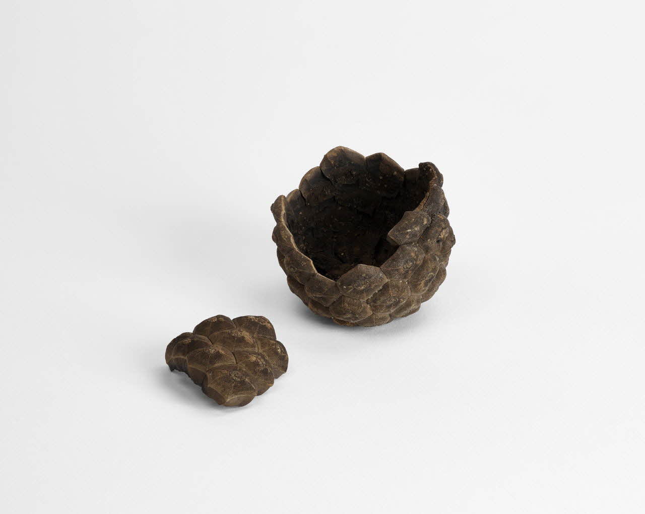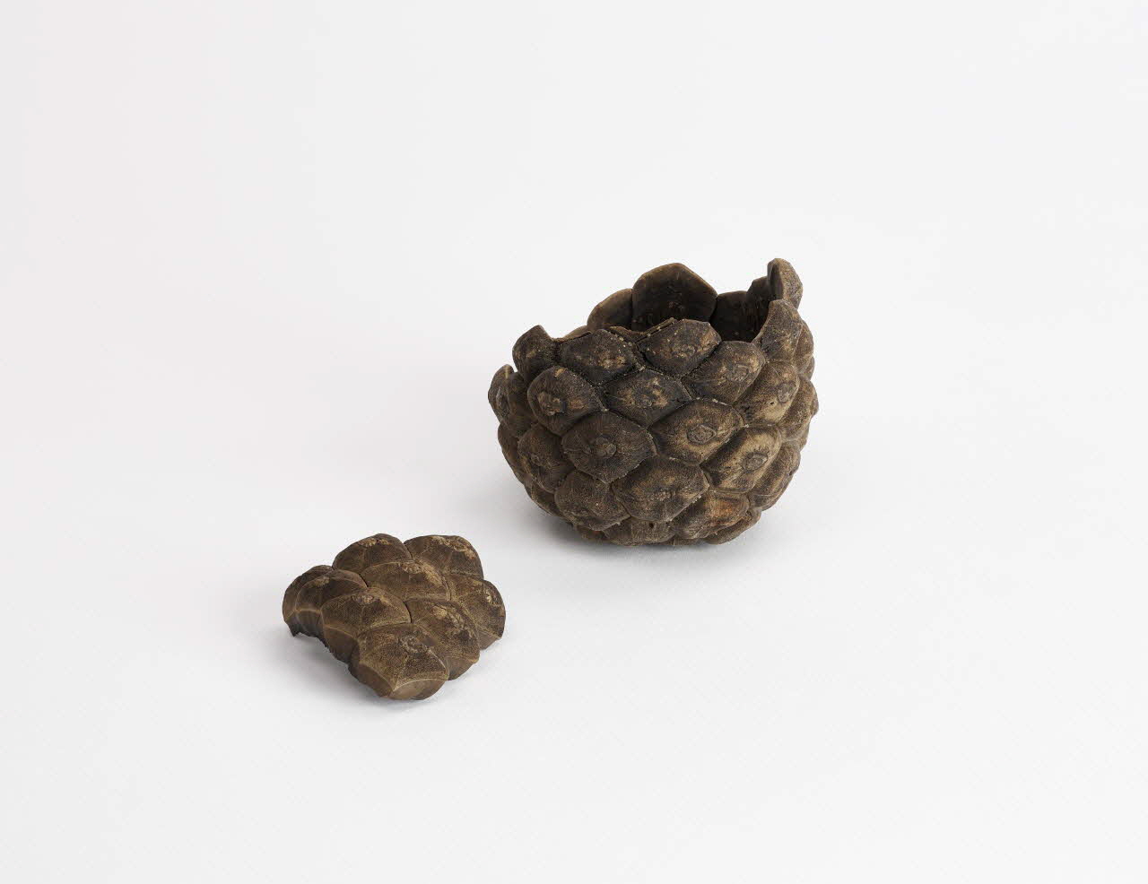 Pomme de pin évidée cassée en deux morceaux.Matériaux et techniques