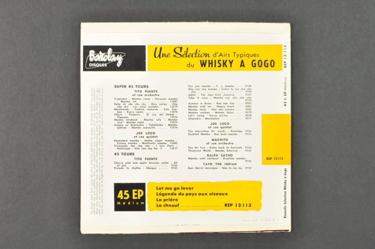 Au verso, le fond blanc présente des inscriptions noires. Les noms du disque et des morceaux se trouvent dans des encarts jaunes.