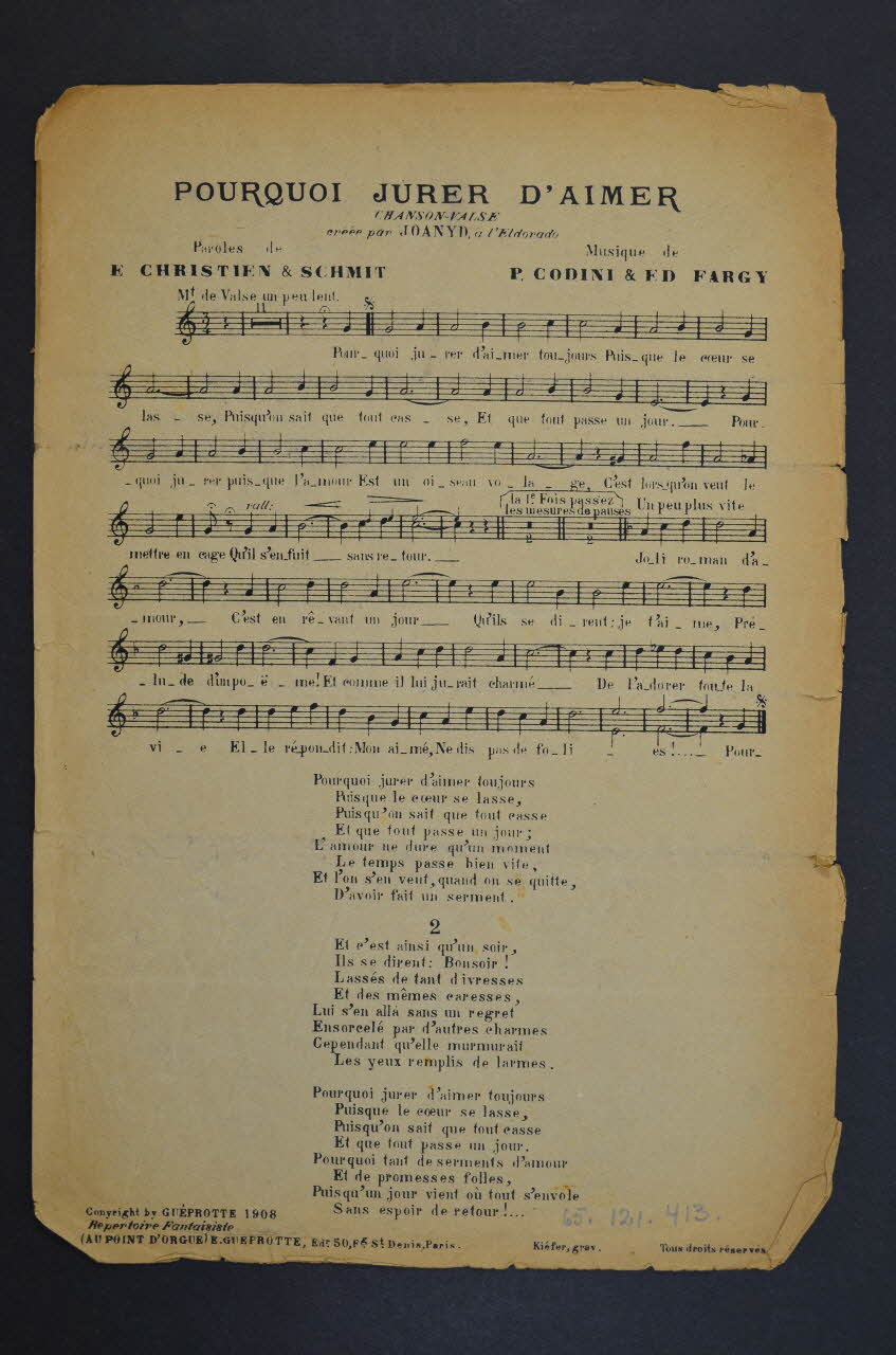 Les inscriptions renseignent le titre de la chanson, le nom des auteurs, de l'artiste et de l'éditeur. Au dos, partition et paroles de la chanson. L'intérieur est laissé vierge.Matériaux et techniques