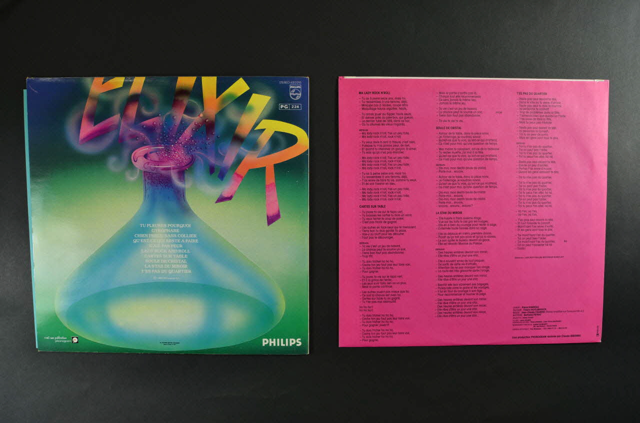 .2 : Pochette en papier cartonné, de forme carrée, pliée et collée. Elle présente le dessin d'une fiole d'où sortent des bulles roses. .3 : pochette intérieure en papier rose, de forme carrée, pliée et collée. Elle présente les paroles des chansons à l'encre noire.Matériaux et techniques