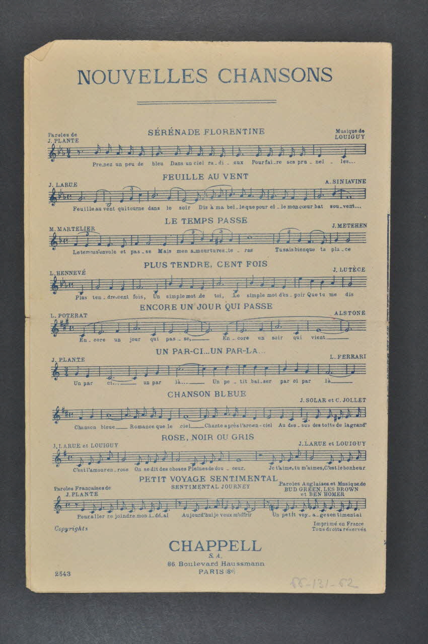 Les inscriptions renseignent le titre de la chanson, le nom des auteurs, de l'artiste et de l'éditeur. A l'intérieur, partitions et paroles de la chanson. Au dos, liste d?autres partitions publiées par l?éditeur.Décor