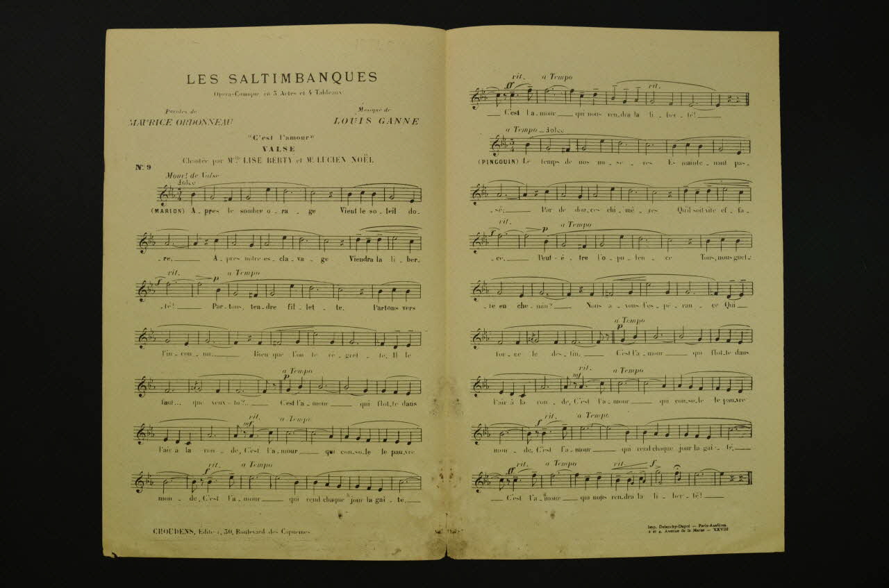Les inscriptions renseignent le titre de la chanson, le nom des auteurs, de l'artiste et de l'éditeur. A l'intérieur, partitions et paroles de la chanson. Au dos, liste d?autres partitions publiées par l?éditeur.Décor
