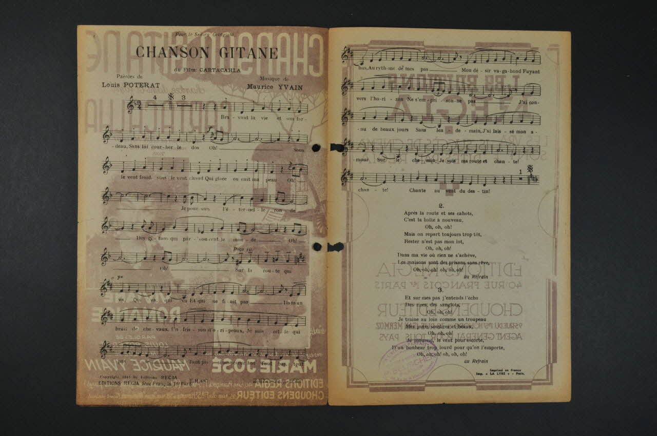 Feuillet rectangulaire en papier industriel imprimé à l'encre brune (sauf à l'intérieur, encre noire). Sur la couverture, un portrait photographique de Viviane Romance et de Marie-José sur un fond dessiné représentant une roulotte sous un arbre.