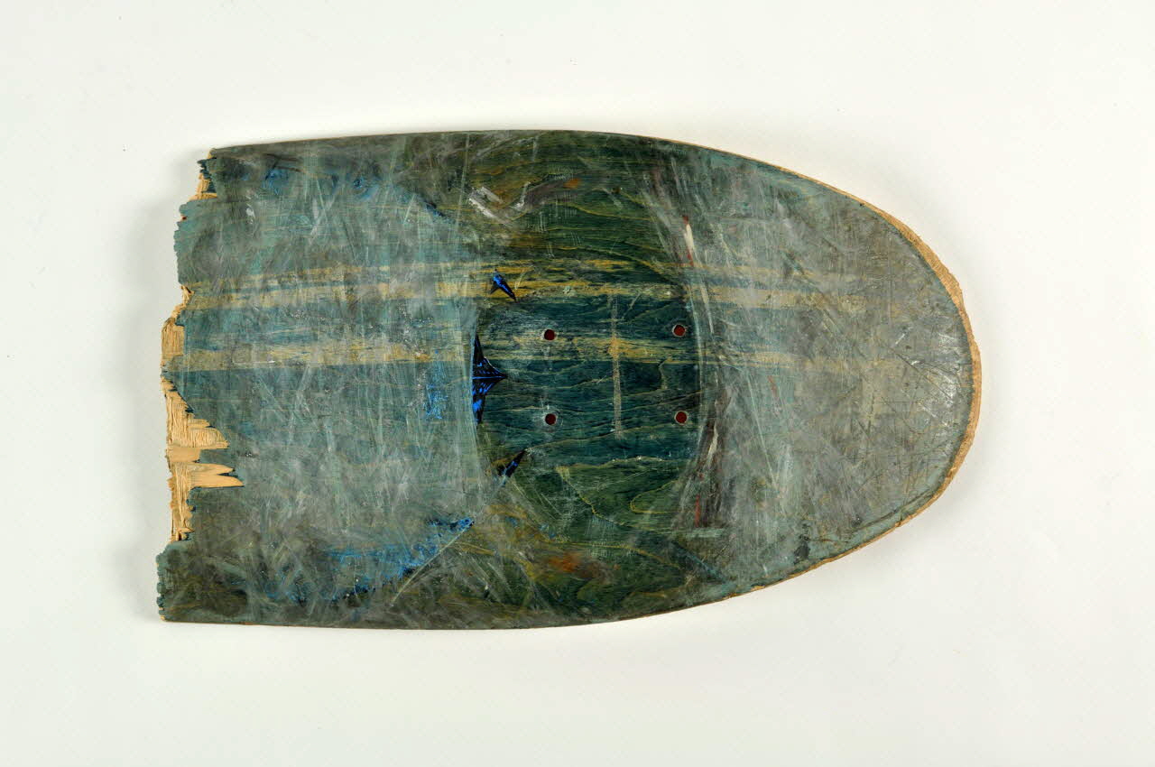 Lieu : FranceDate : 4e quart 20e sièclePlanche de skateboard utilisée durant une courte période car présentant un défaut. Planche retournée au distributeur (Vaissette).