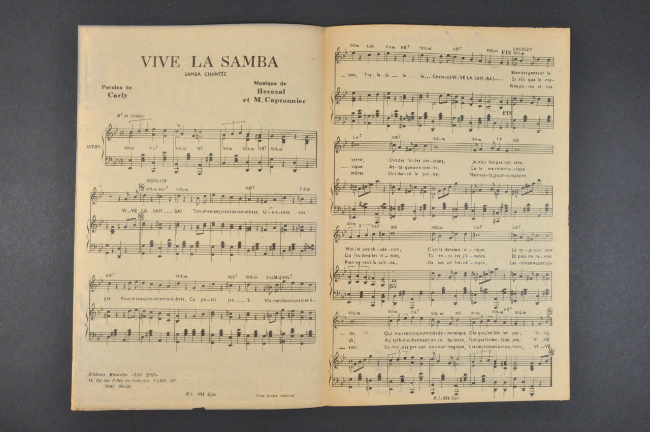 La première page présente la photographie de La Houppa. Les inscriptions précisent le titre de la chanson, l'auteur et l'éditeur. A l'intérieur se trouvent la partition et les paroles de la chanson. Au dos, une liste de morceaux disponibles chez le même éditeur.Matériaux et techniques