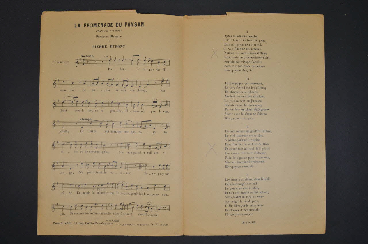 Des inscriptions renseignent le titre, les auteurs, les exécutants et l'éditeur. A l'intérieur, partition et paroles de la chanson. Au dos, liste d'autres partitions publiées par l'éditeur.Décor