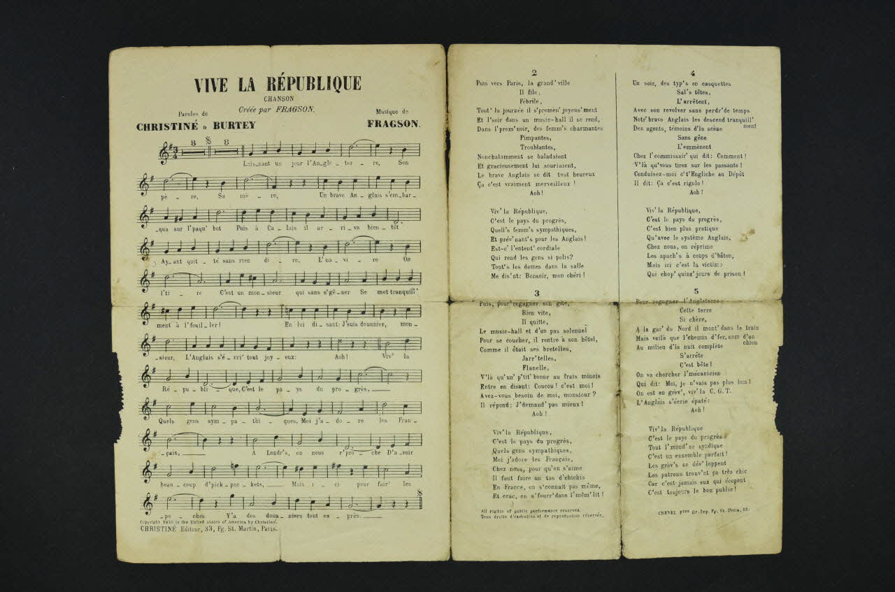 Des inscriptions renseignent le titre, les auteurs, les exécutants et l'éditeur. A l'intérieur, partition et paroles de la chanson. Au dos, liste d'autres partitions publiées par l'éditeur.Décor