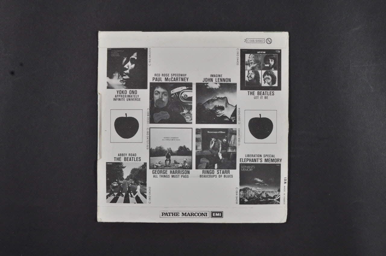 Le recto comporte une photographie noir et blanc de la chanteuse. Le nom de l'artiste et le titre des chansons sont inscrits dans la partie droite en blanc ou en vert. Le logo de l'éditeur est dans l'angle supérieur gauche. Le verso contient huit vignettes noir et blanc présentant d'autres albums de la maison de disques, ainsi que le logo de l'éditeur. Le disque rond et noir comporte une perforation circulaire au centre. Une étiquette verte avec une moitié de pomme contenant le nom de la chanteuse, le titre des chansons, le logo de l'éditeur ainsi que d'autres inscriptions en noir est collée au centre.Matériaux et techniques