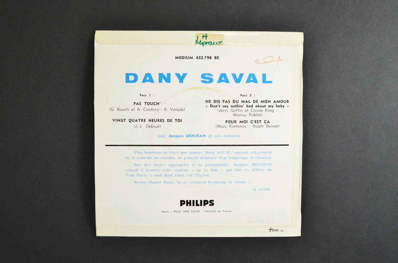 Le recto comporte une photographie couleur légèrement stylisée de la chanteuse. Le nom de l'artiste en vert et les titres des chansons sont inscrits dans la partie supérieure gauche. Le logo de l'éditeur est dans l'angle inférieur gauche. Le verso contient le nom de l'artiste en bleu, les titres des chansons, et une courte présentation et le logo de l'éditeur sur fond blanc. Un onglet blanc avec des inscriptions noires est situé le long de la bordure gauche. Le verso présente une étiquette blanche collée avec le nom du donateur en vert dans la partie supérieure. Il y a également une marque au feutre violet au dessous.Matériaux et techniques