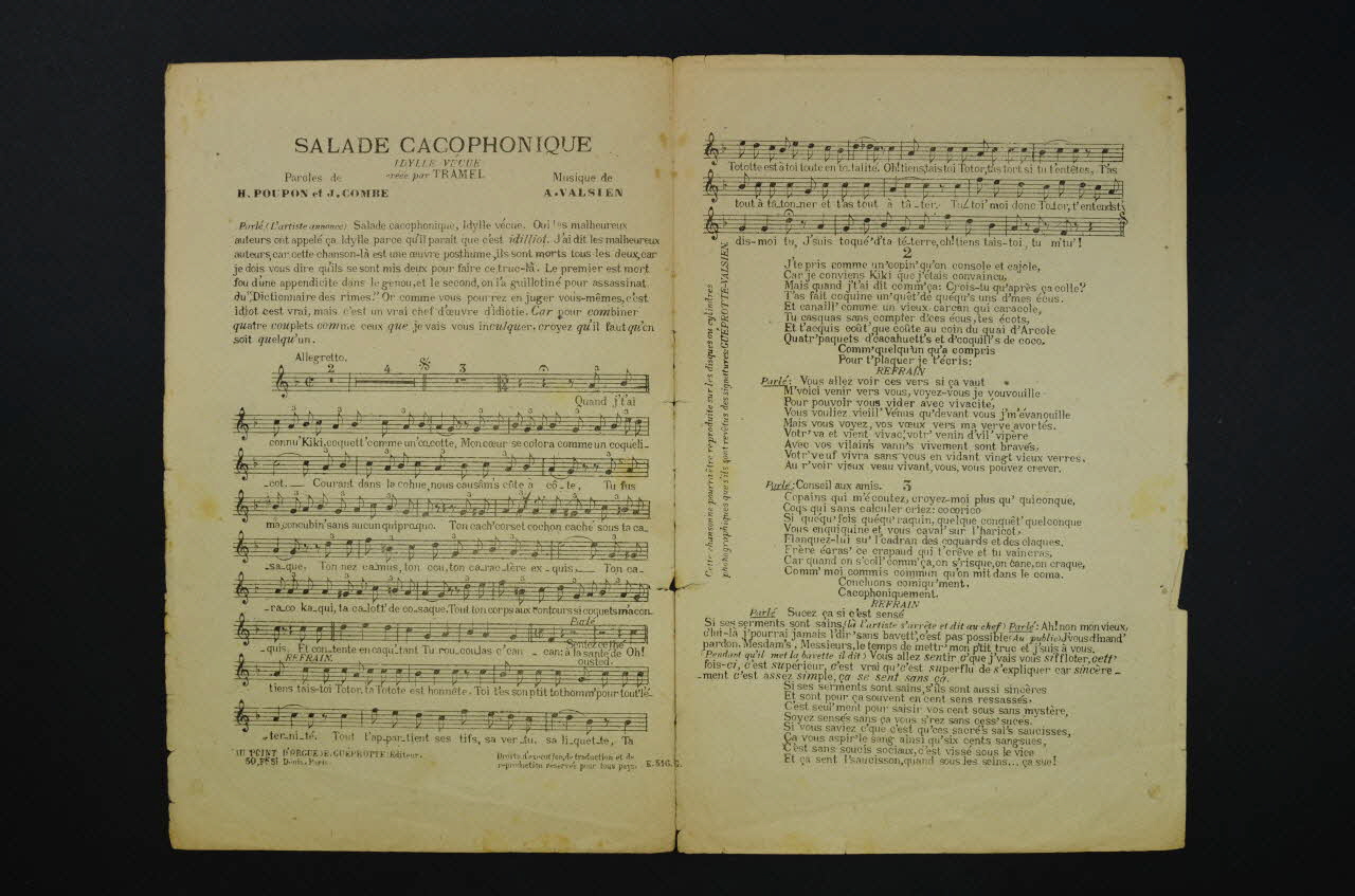 Les inscriptions renseignent le titre de la chanson, le nom des auteurs, de l'artiste et de l'éditeur. A l'intérieur, partition et paroles de la chanson. Au dos, liste d?autres partitions publiées par l?éditeur.Matériaux et techniques