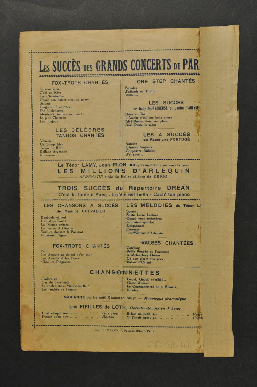 Les inscriptions renseignent le titre de la chanson, le nom des auteurs, de l'artiste et de l'éditeur. A l'intérieur se trouvent la partition et paroles de la chanson. Au dos, une liste d?autres partitions publiées par l?éditeur.Matériaux et techniques