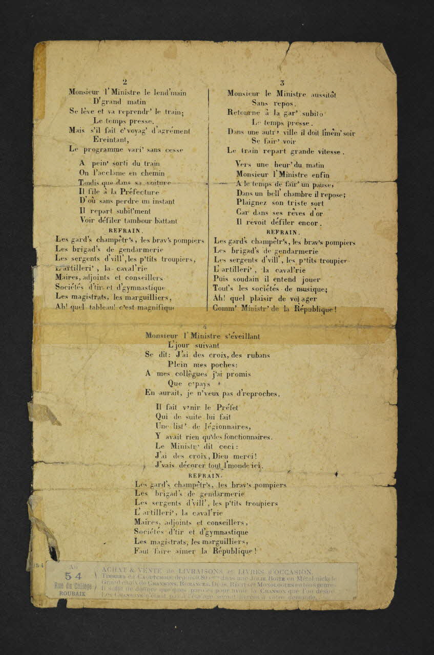 Les inscriptions renseignent le titre de la chanson, le nom des auteurs, de l'artiste et de l'éditeur. A l'intérieur, la partition et les paroles. Au dos, une liste de titres disponibles chez le même éditeur. Une bande de papier comporte une publicité pour une librairie en partie basse.Décor