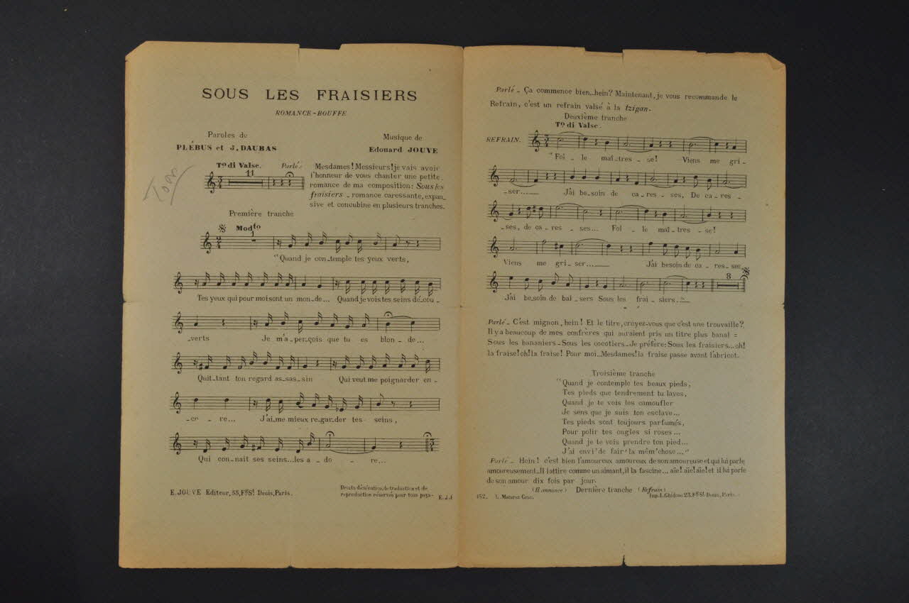 Feuillet rectangulaire en papier industriel imprimé à l'encre. L'intérieur comporte les paroles et la partition de la chanson. Au dos, publicité pour l'éditeur