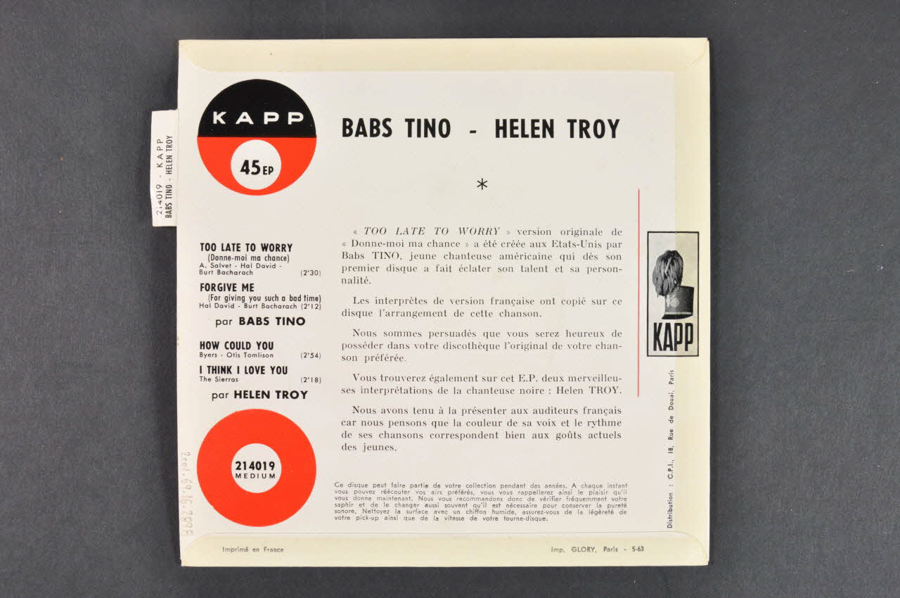 Pochette de disque de forme carrée, en papier plié et collé. Le recto comprend un fond mi-noir et mi-blanc recouvert de texte (nom de l'auteur, titre de l'album et du morceau...) de couleur jaune, blanche, rose et rouge. Au verso figurent en noir sur fond blanc ; des inscriptions telles que le nom de l'artiste et le titre des morceaux et leur durée. Une languette présente sur le côté supérieur gauche indique en noir le nom des artistes.Matériaux et techniques