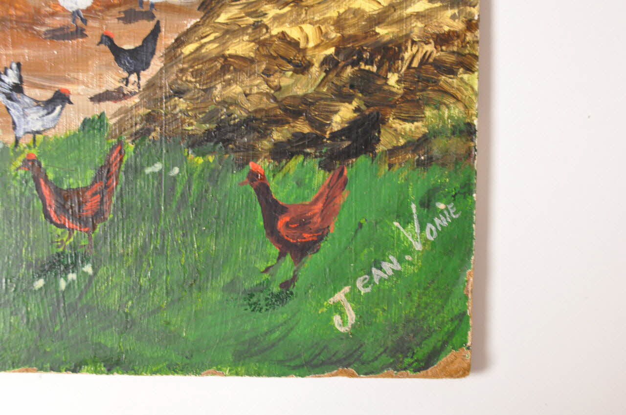 Le tableau représente une ferme entourée d'un paysage de verdure.