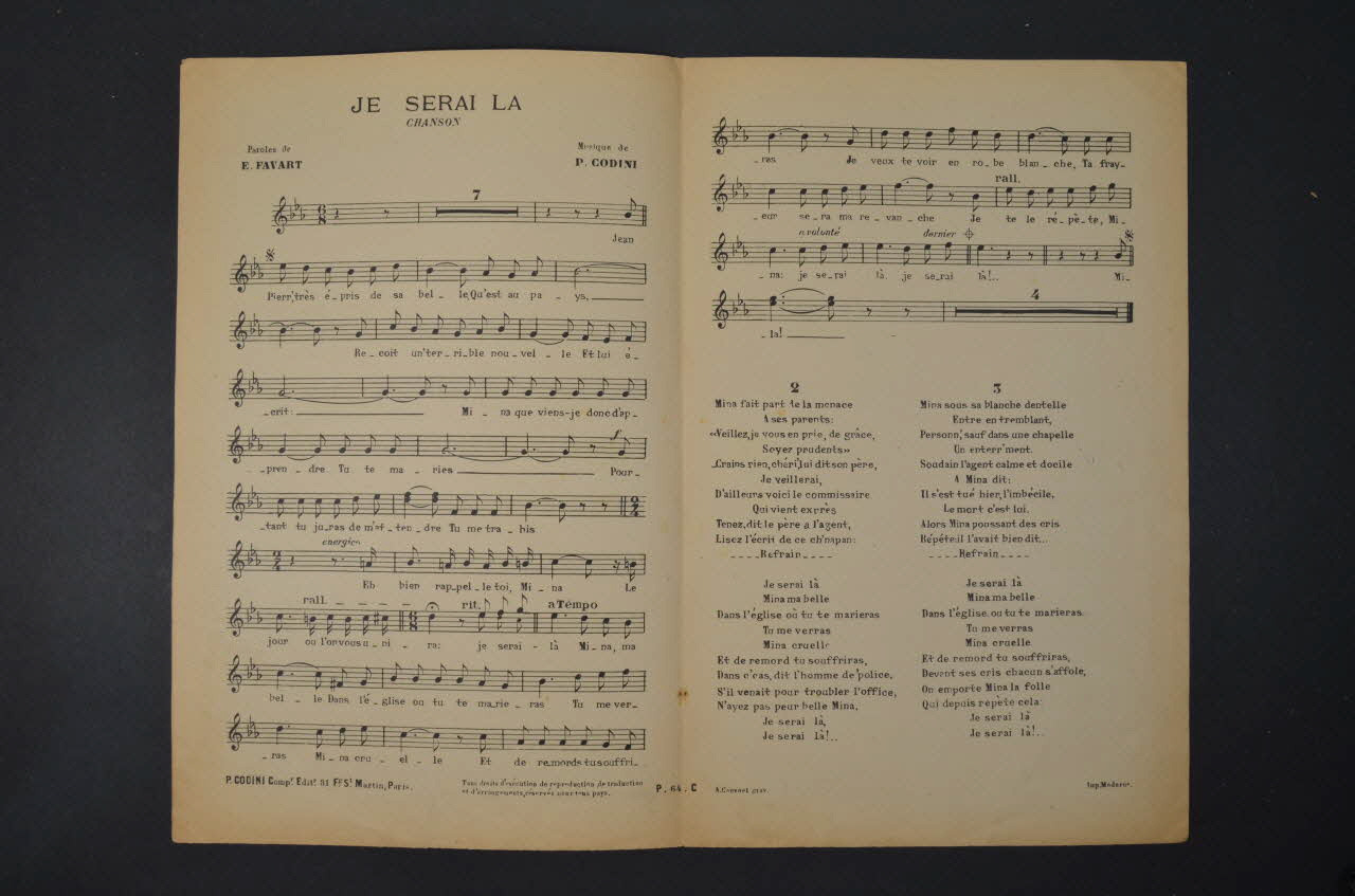 Les inscriptions renseignent le titre de la chanson, le nom des auteurs, de l'artiste et de l'éditeur. A l'intérieur, partition et paroles de la chanson. Au dos, liste d?autres partitions publiées par l?éditeur.Décor