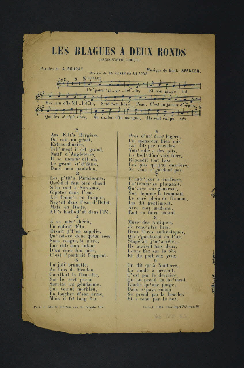 Les inscriptions précisent l'auteur de la chanson, les interprètes et l'éditeur du feuillet. L'intérieur et le dos comportent la partition et les paroles.Décor