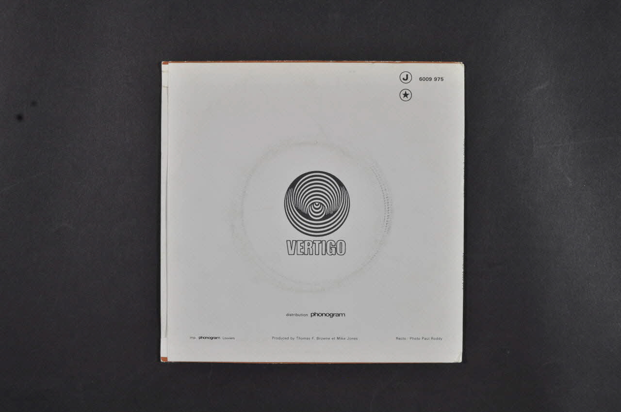 Le recto comporte un portrait couleurs du chanteur en train de fumer. Le nom de l'artiste et le titre des chansons en rose et violet encadrent la photographie. Le logo de l'éditeur est dans l'angle supérieur droit. Le verso contient le logo de l'éditeur au centre du fond blanc. Le disque rond et noir comporte une perforation circulaire au centre. Le centre en plastique bleu contenant le nom du chanteur, le titre des chansons, le logo de l'éditeur ainsi que d'autres inscriptions en noir.Matériaux et techniques