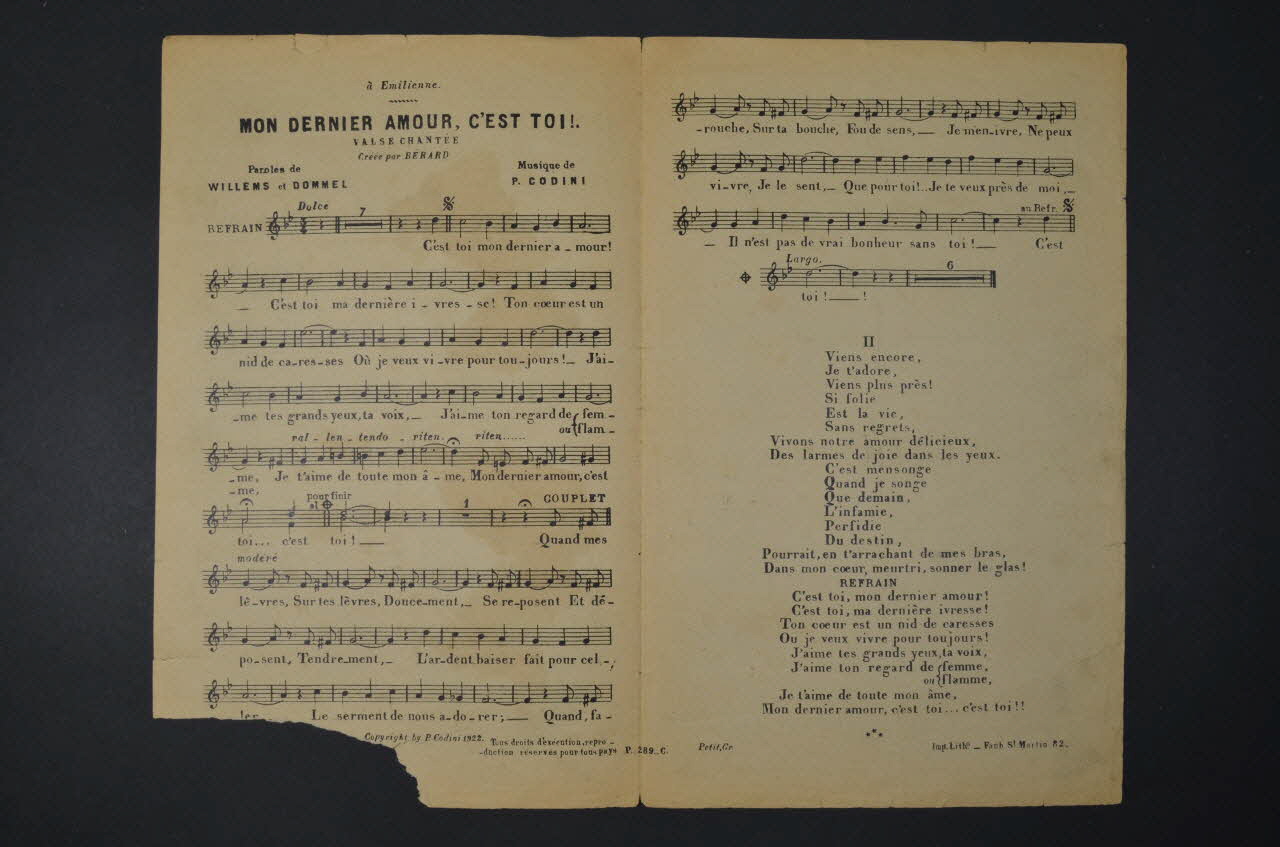 Les inscriptions renseignent le titre de la chanson, le nom des auteurs, de l'artiste et de l'éditeur. A l'intérieur, partitions et paroles de la chanson. Au dos, liste d?autres partitions publiées par l?éditeur.Décor