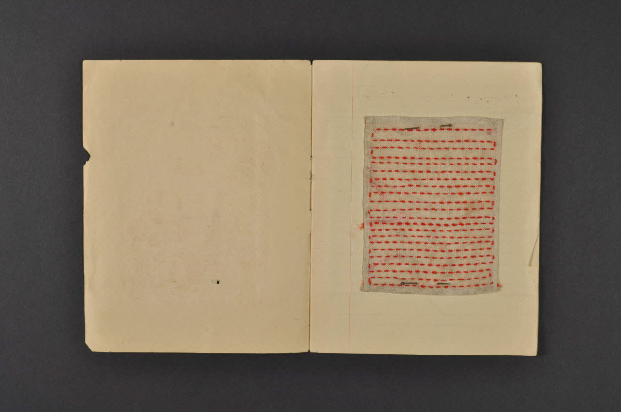 De forme rectangulaire avec une couverture illustrée de l'homme de l'âge de la pierre et un texte écrit au verso du cahier ; à l'intérieur, trois travaux de couture maintenus sur le papier grâce à des épingles.Inscriptions