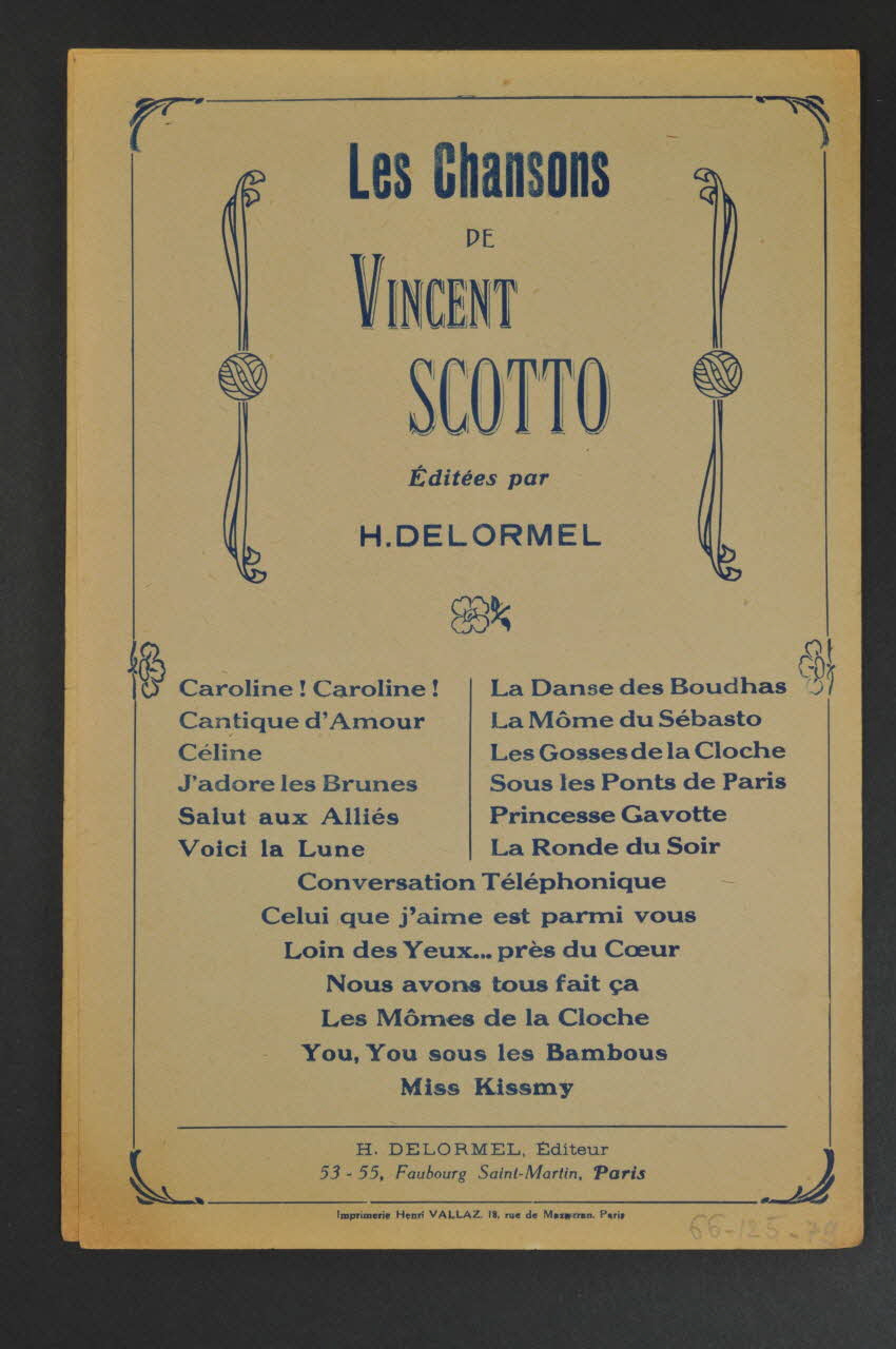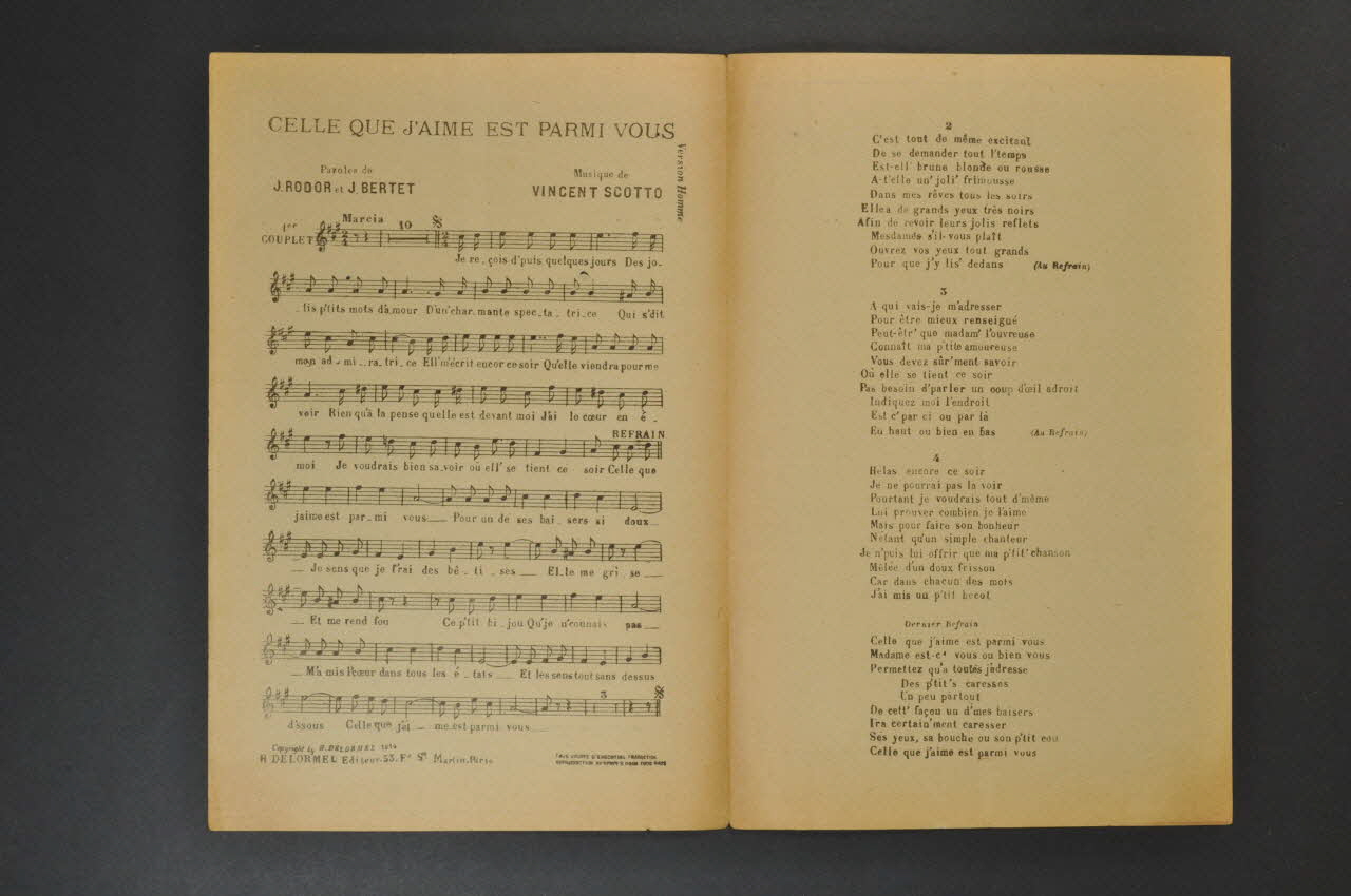 Les inscriptions renseignent le titre de la chanson, le nom des auteurs, de l'artiste et de l'éditeur. A l'intérieur, partitions et paroles de la chanson. Au dos, liste d?autres partitions publiées par l?éditeur.Décor