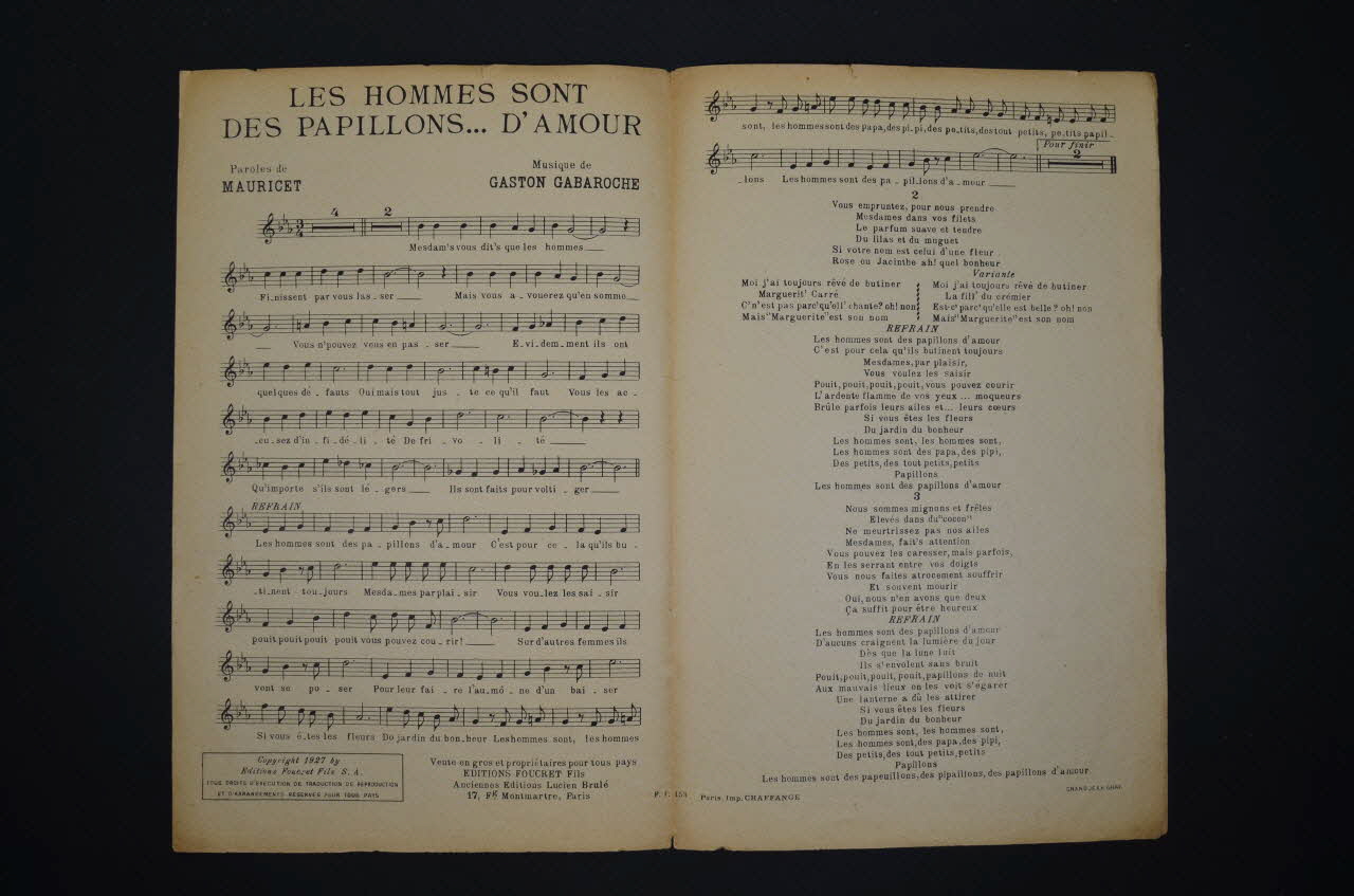 Feuillet rectangulaire en papier industriel imprimé. Le feuillet contient la partition et les paroles de la chanson. Au, dos, publicité pour l'éditeur.