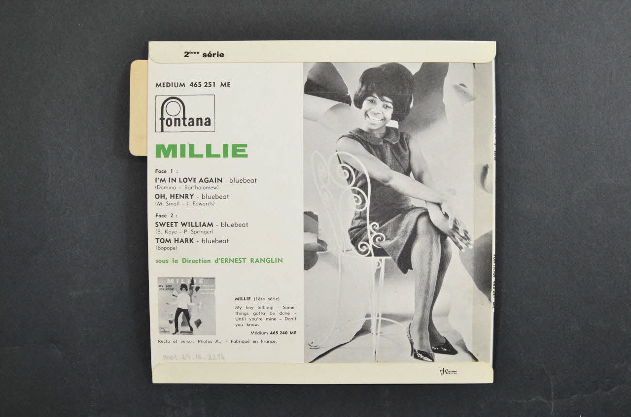 Au recto le fond représente la photo, en couleur de la chanteuse. En haut figurent des inscriptions en blanc et jaune. Au verso, le fond est blanc avec des inscriptions noires et vertes/ A droite, figure une photo en noir et blanc de la chanteuse.Matériaux et techniques