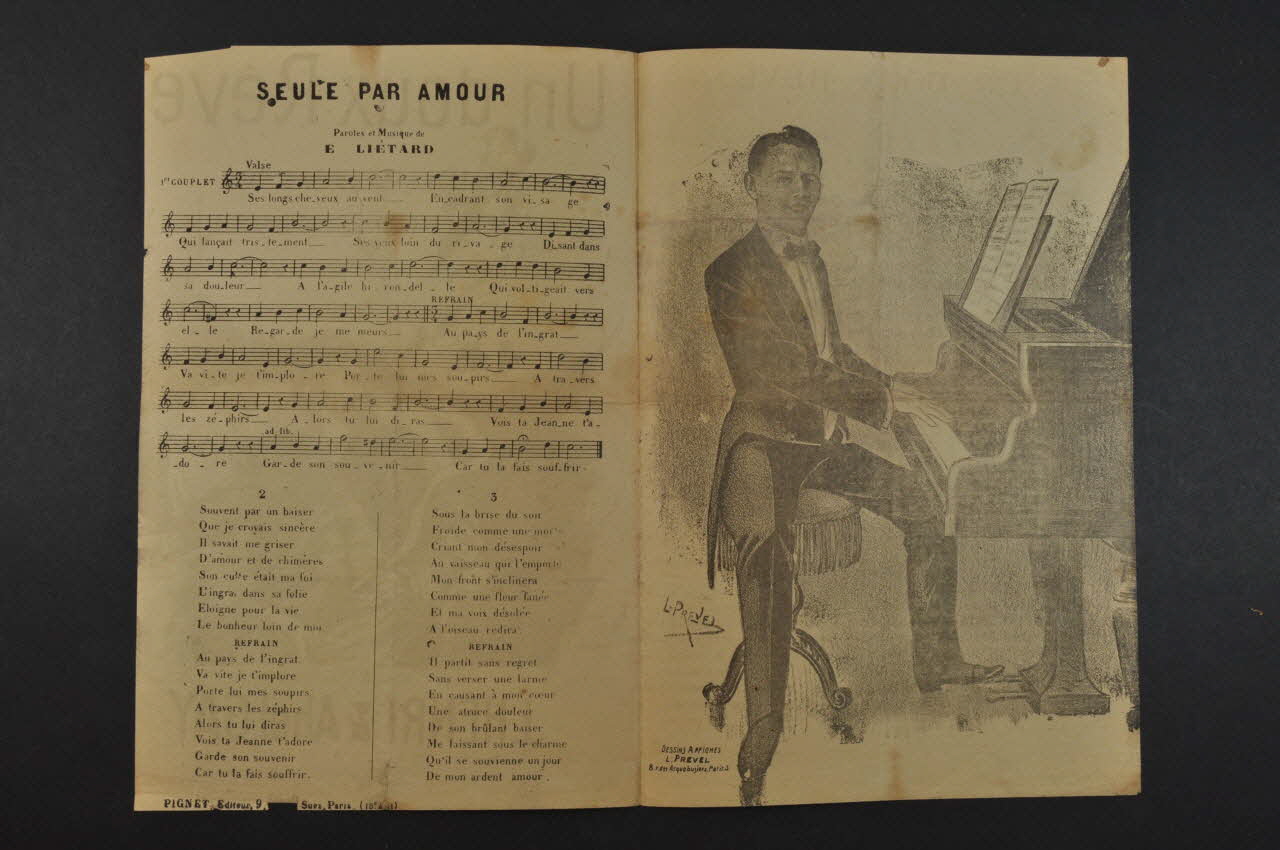 Des inscriptions renseignent le titre, les auteurs, les exécutants et l'éditeur. A l'intérieur et au dos, les partitions et paroles des chansons, ainsi que le dessin d'un pianiste à l'intérieur.Décor
