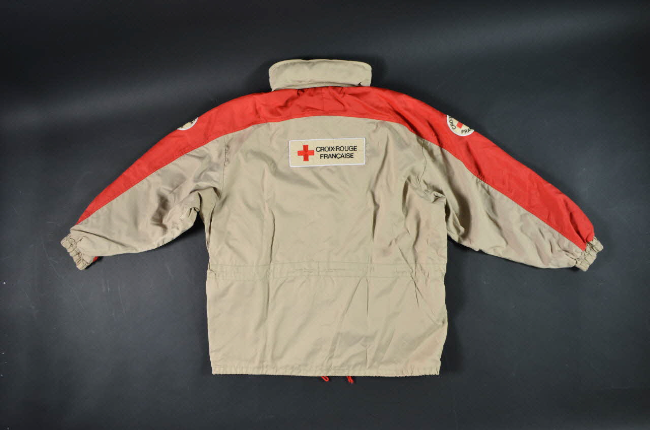 Le dos du manteau est beige et comporte le même écusson que sur le devant à plus grande échelle au milieu en haut. La bande de tissu rouge présente sur les manches se prolonge à l'horizontal en haut. Le col du blouson est doté d'une fermeture éclair et accueille une capuche repliée à l'intérieur.