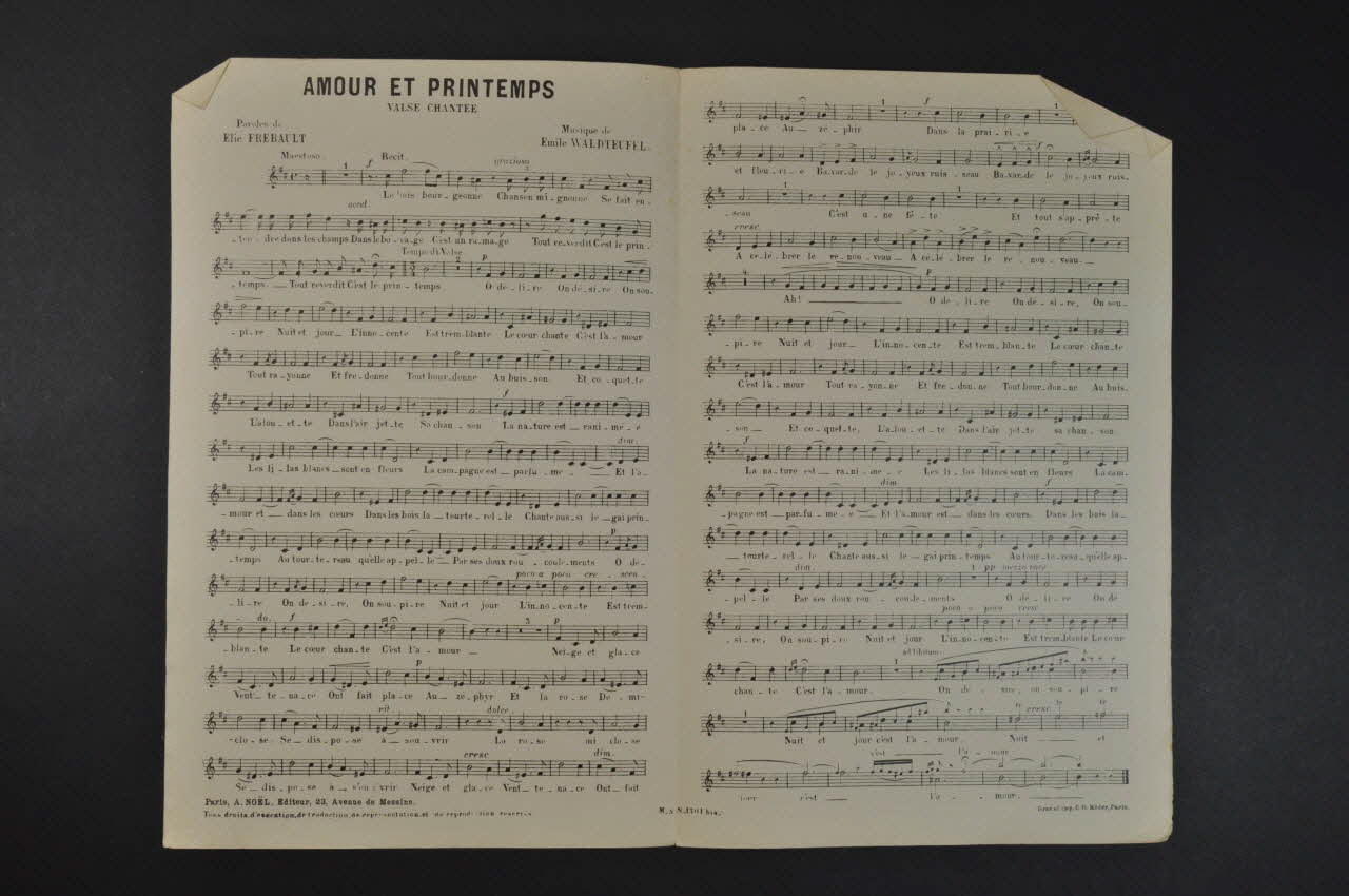 Les inscriptions renseignent le titre de la chanson, le nom des auteurs, de l'artiste et de l'éditeur. A l'intérieur et au dos, les partitions et les paroles des chansons.Décor