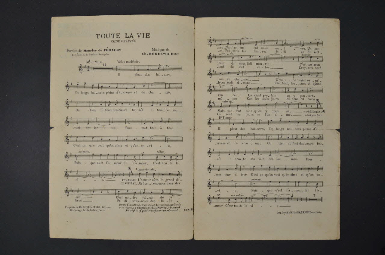 Des inscriptions renseignent le titre, les auteurs, les exécutants et l'éditeur. A l'intérieur, partition et paroles de la chanson. Au dos, liste d'autres partitions publiées par l'éditeur.Décor