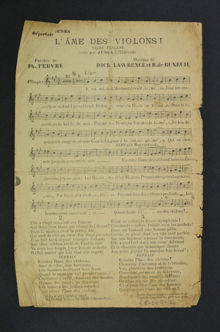 Les inscriptions renseignent le titre de la chanson, le nom des auteurs, de l'artiste et de l'éditeur. L'intérieur est laissé vierge. Au dos, la partition et les paroles.Décor