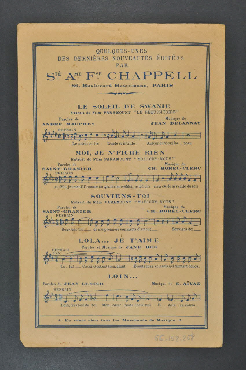 Les inscriptions renseignent le titre de la chanson, le nom des auteurs, de l'artiste et de l'éditeur. A l'intérieur, partitions et paroles de la chanson. Au dos, liste d?autres partitions publiées par l?éditeur.Décor