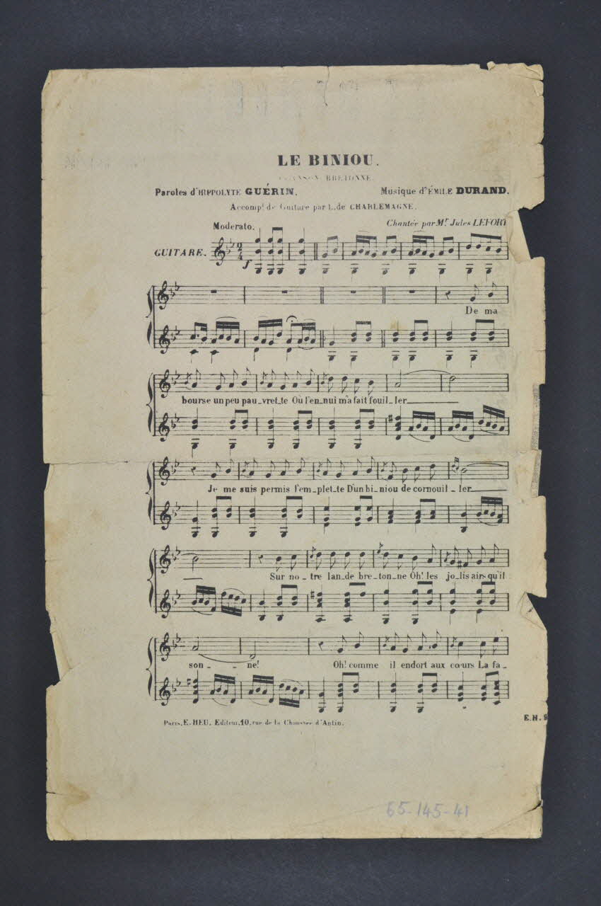 Sur le recto, la représentation d'un joueur de biniou, en costume traditionnel breton, dans les landes avec bouc, moutons et bovins paissant au lointain. Les inscriptions renseignent le titre de la chanson, le nom des auteurs, de l'artiste et de l'éditeur. Au verso, partition et paroles de la chanson.Décor