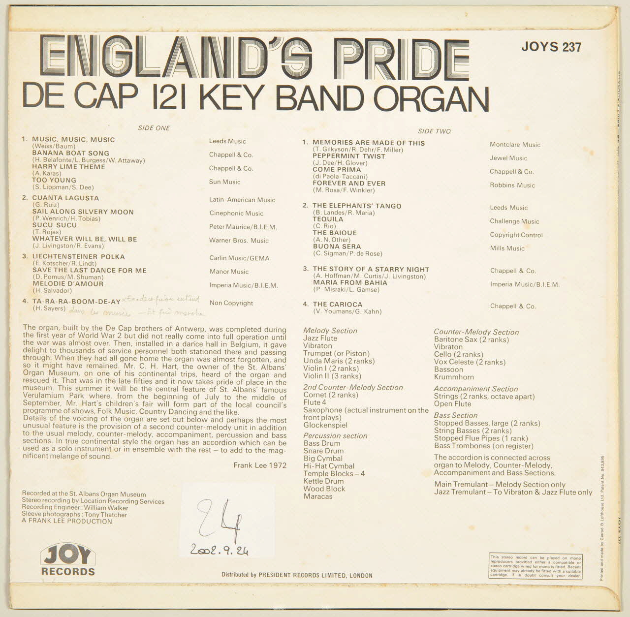 disque 33 tours, Liechtensteiner polka, The baique, Cuanta lagusta, England's Pride, Come prima, Buona sera, Forever and ever, Peppermint twist, Mélodie d'amour, The story of a starry night, Too young, The Carioca, Music, music, music, Sucu sucu, Save the last dance for me, Memories are made of this, Ta-ra-ra-boom-de-ay, Tequila, Sail along silvery moon, Banana boat song, Maria from bahia, Whatever will be, will be, The elephant's tango, Harry lime theme