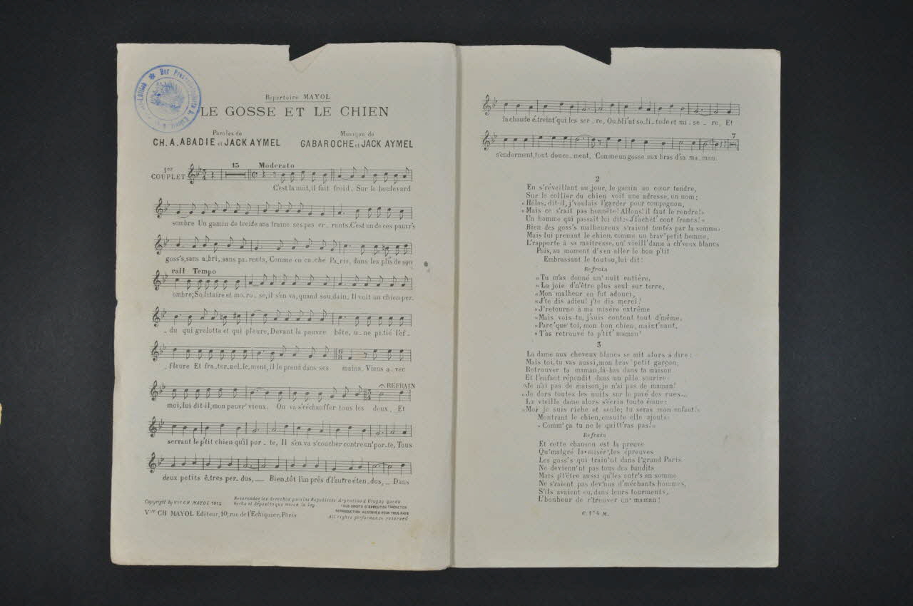 Feuillet rectangulaire en papier industriel, imprimé à l?encre bleue (sauf l?intérieur à l?encre noire). La couverture du feuillet présente la photographie de Mayol dans un médaillon et un dessin d'un jeune garçon tenant un chien.