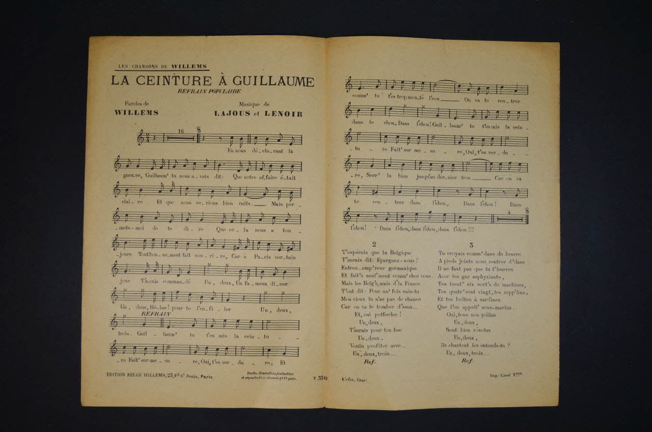 Feuillet rectangulaire en papier industriel imprimé. Le feuillet contient la partition et les paroles de la chanson. Au dos, publicité pour l'éditeur.Matériaux et techniques