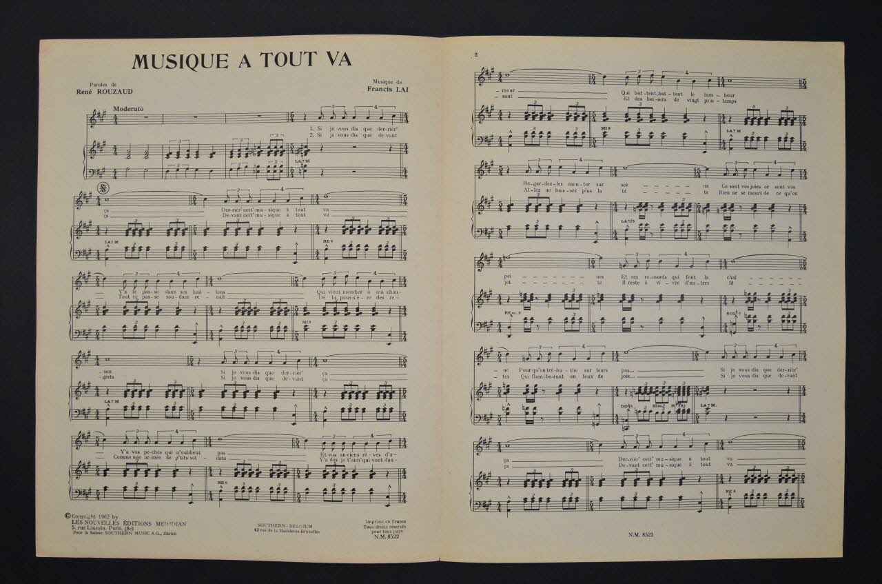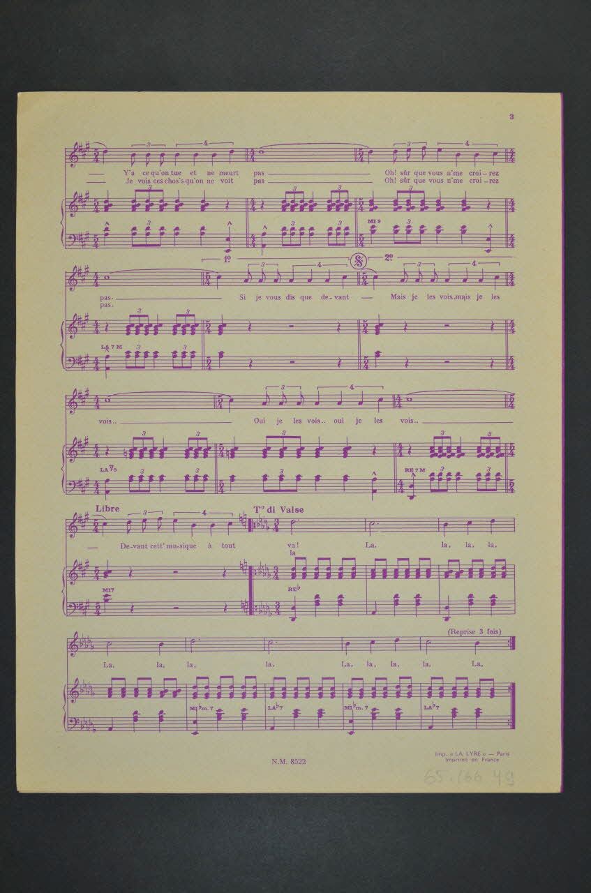 Les inscriptions précisent l'auteur de la chanson, les interprètes et l'éditeur du feuillet. L'intérieur et le dos comportent la partition et les paroles.Décor