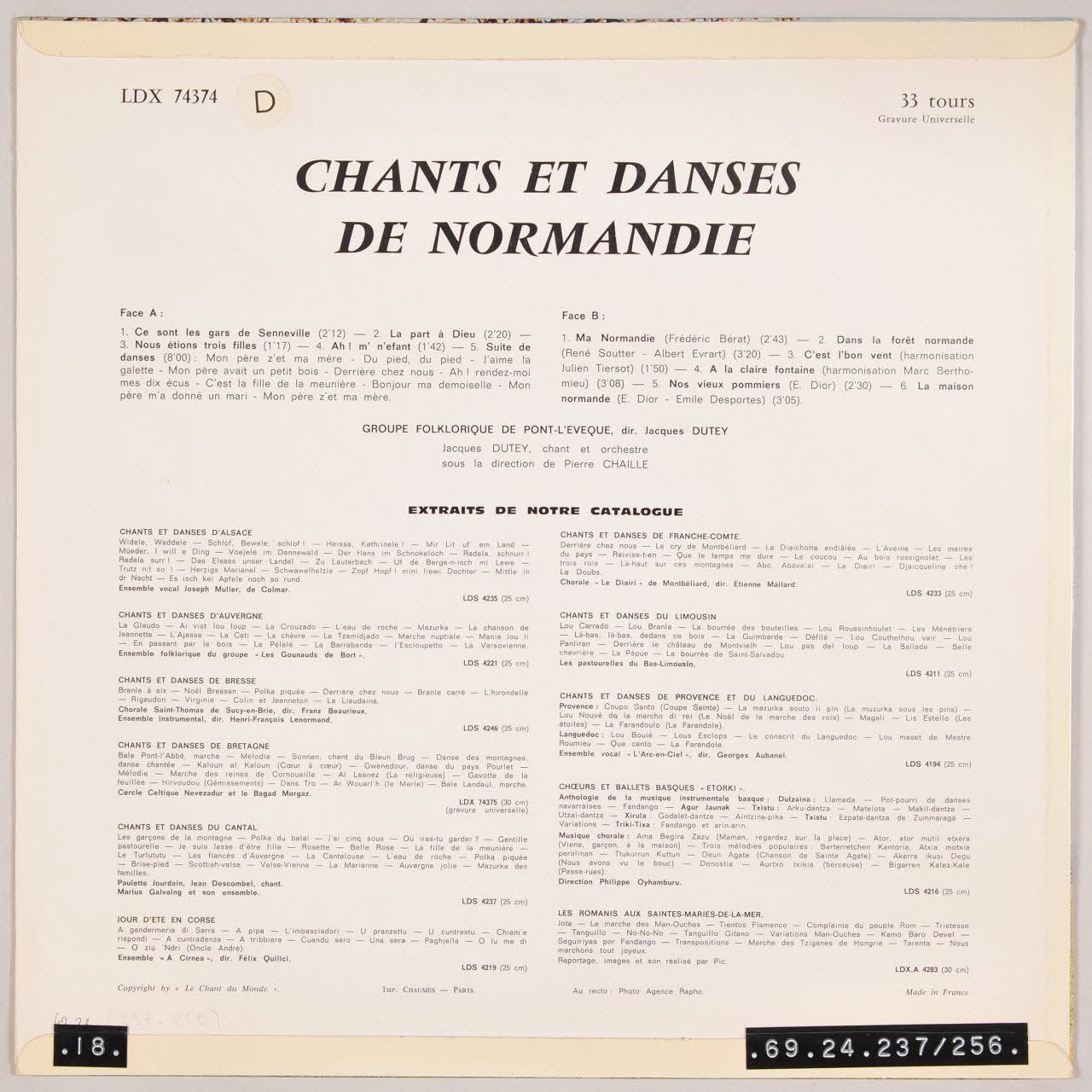 disque 33 tours, Ah! M'efant, Nos vieux pommiers, Ce sont les gars de Senneville, Ma Normandie, C'est l'bon vent, La maison normande, Chants et danses de Normandie, Dans la forêt normande, La part à Dieu, A la claire fontaine, Nous étions trois filles